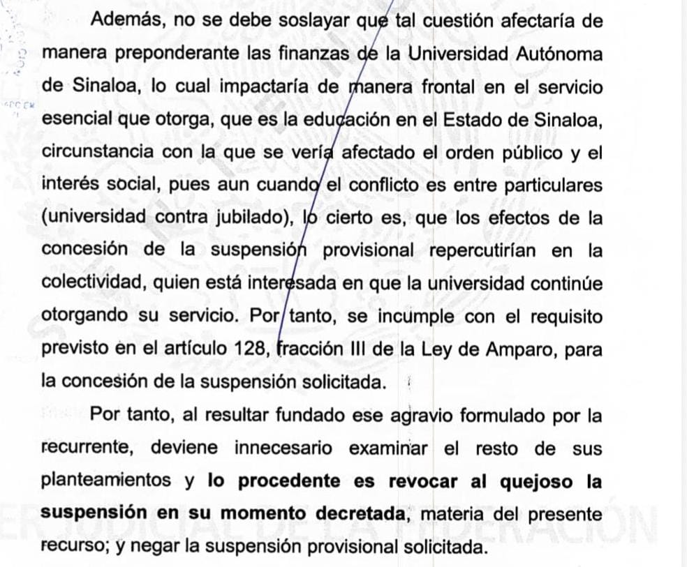 En segundo lugar, el Tribunal consideró que mantener la suspensión afectaría el interés social y el orden público, al comprometer las finanzas de la universidad y, con ello, el servicio esencial de educación superior que presta a miles de estudiantes sinaloenses.