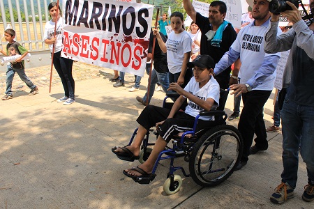 Uno de ellos es un menor de 13 años que se sumó a la protesta acompañado en su silla de ruedas qué le ayuda a movilizarse ya que desde la agresión se encuentra inválido.