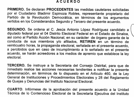 Culiacán, Sin.-El Cuarto Consejo Distrital de Guasave ordenó al Partido Acción Nacional retirar en un lapso de 24 horas toda la propaganda que se encuentre fijada en el equipamiento urbano como lo es postes de alumbrado público, semáforos, entre otros.